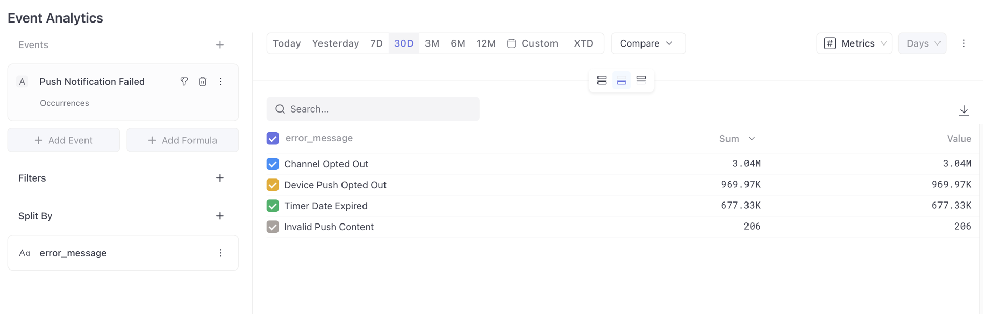 Track an event FCMTokenError on WebEngage and analyze it in Event analytics to understand and assess the impact and frequency of similar events.
